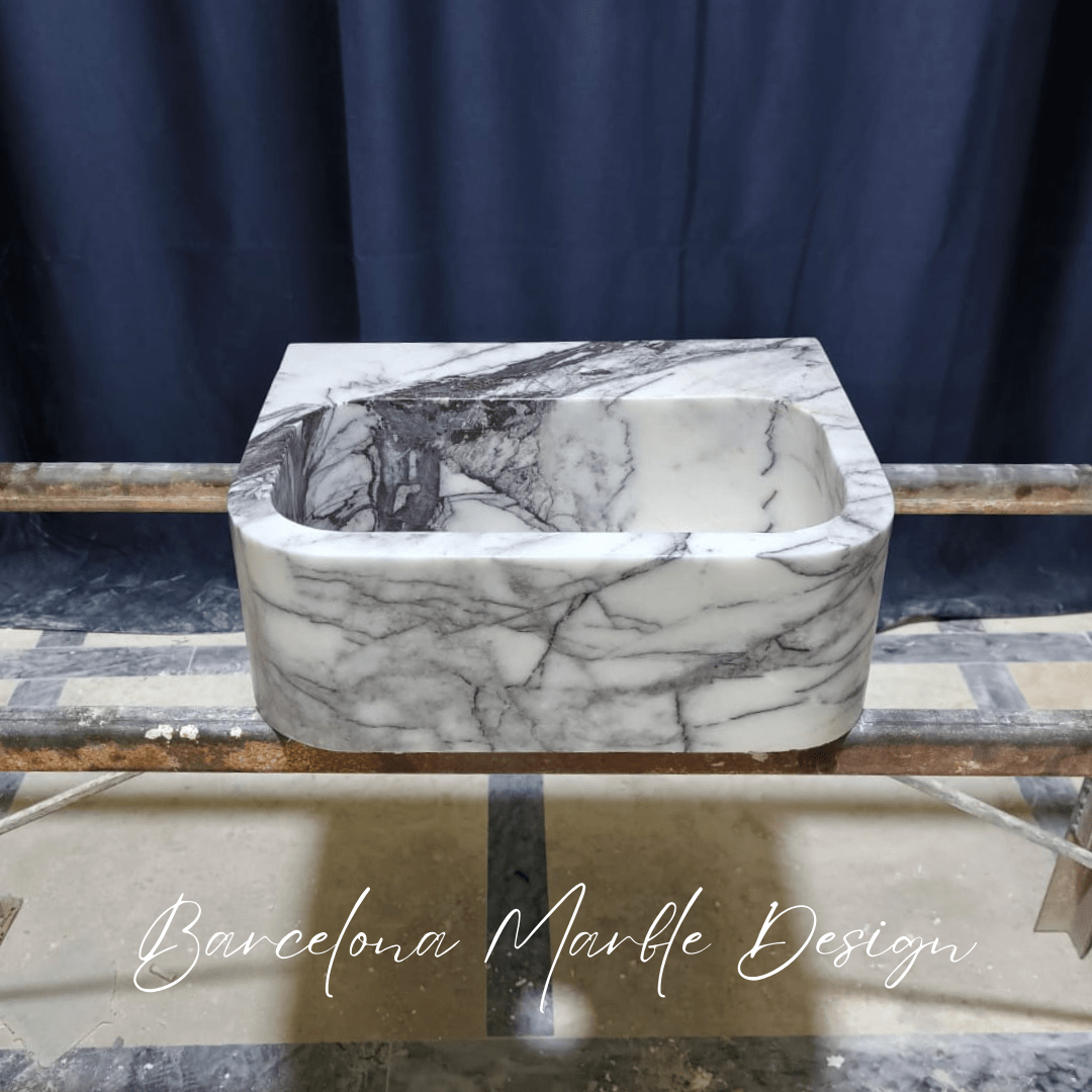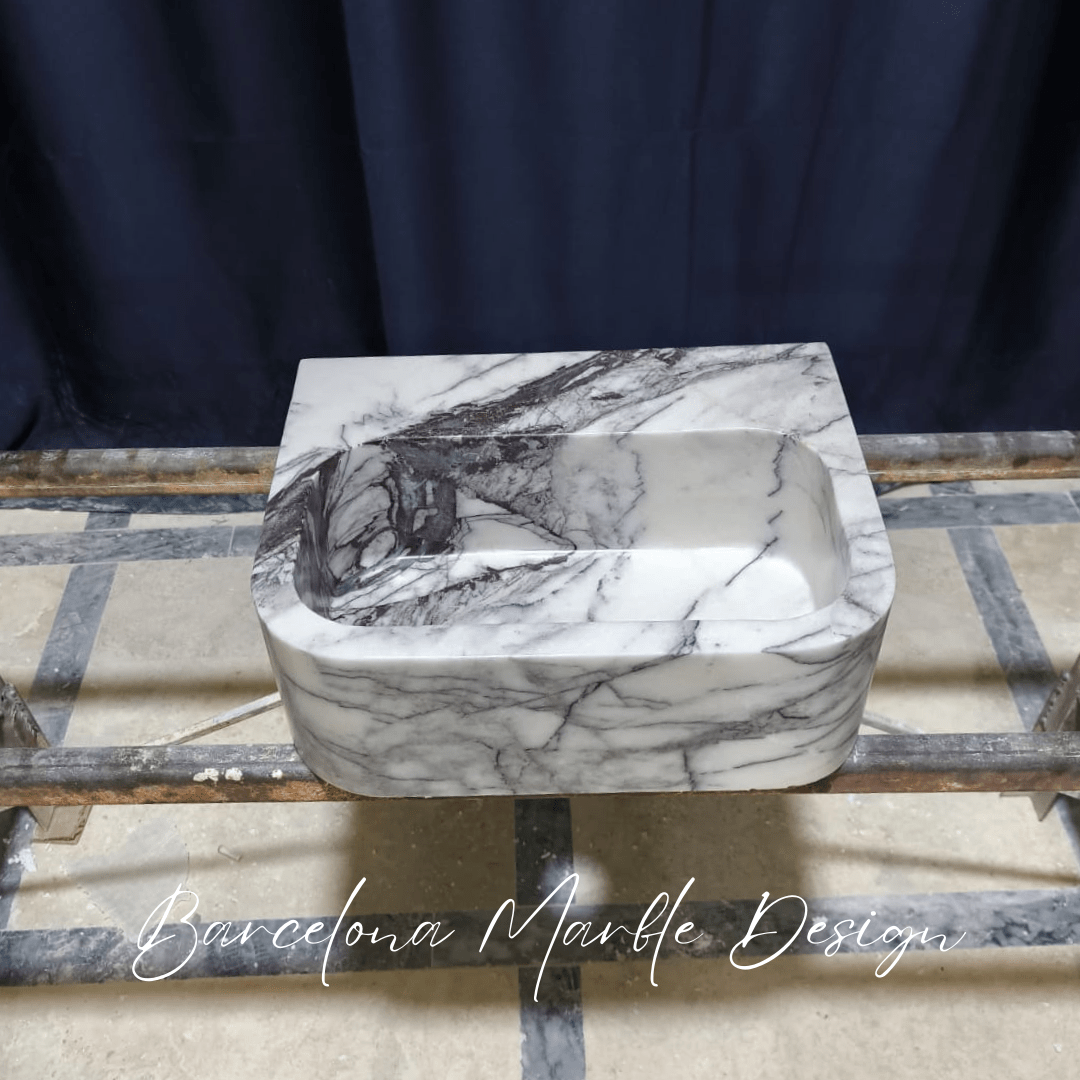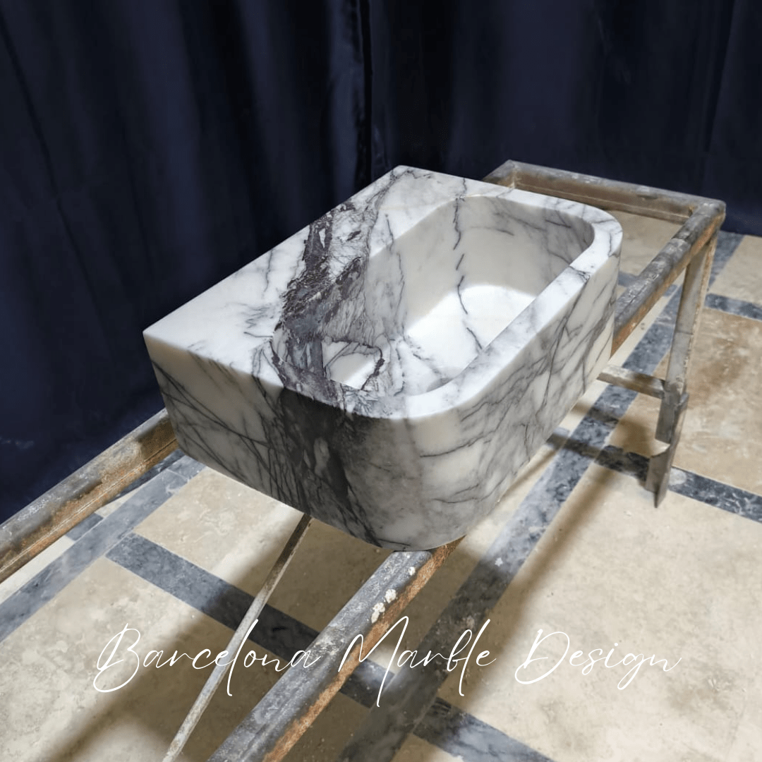 Enhance your bathroom or powder room with the Lilac Marble Wall-Mounted Sink, a stunning piece handcrafted from 100% natural stone by Barcelona Marble Design. Featuring delicate lilac veining against a timeless marble backdrop, this modern yet classic washbasin adds a touch of sophistication to any space.